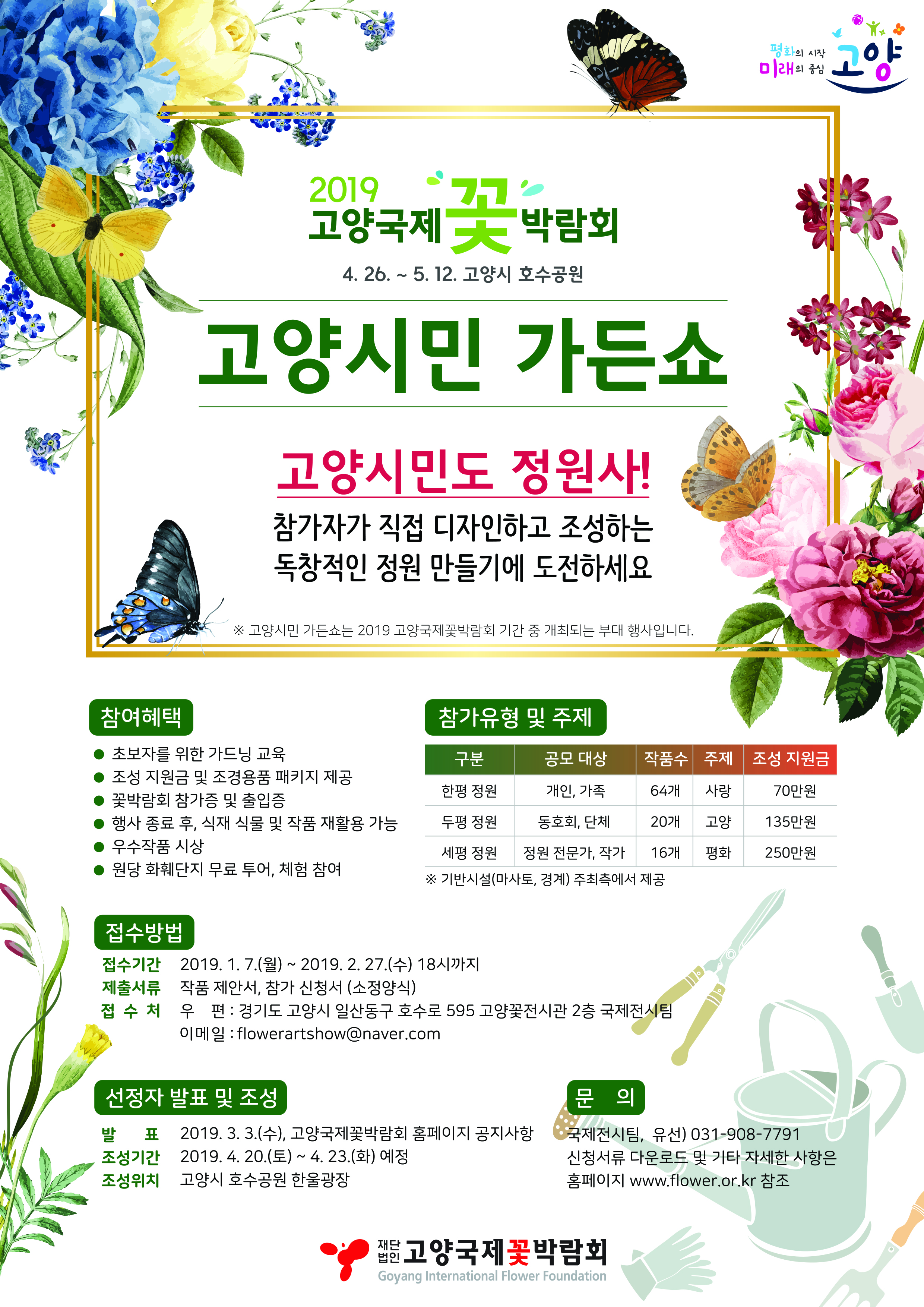재단법인 고양국제꽃박람회 이사장 이재준 고양시장은 “2019고양국제꽃박람회는 시민이 주인공이 되는 축제로 준비하고 있다. 꽃을 사랑하는 고양시민의 많은 관심과 참여를 바란다”고 밝혔다. (문의 : 고양국제꽃박람회 국제전시팀 031-908-7791)