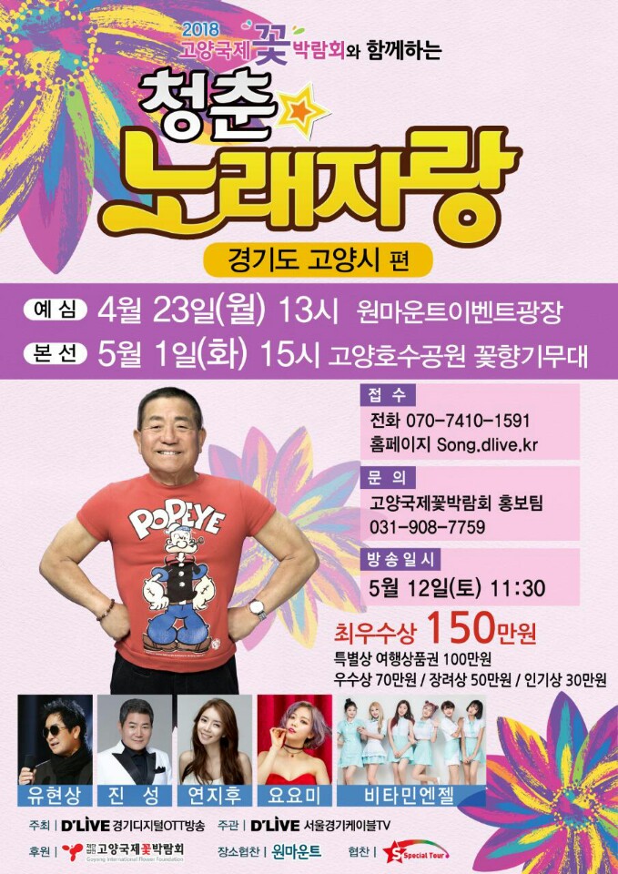 ‘2018고양국제꽃박람회’와 함께 하는 D’LIVE 서울경기케이블TV <청춘노래자랑>이 5월 1일 오후 3시 고양시 호수공원 꽃박람회장 내 꽃향기 무대에서 열린다.
