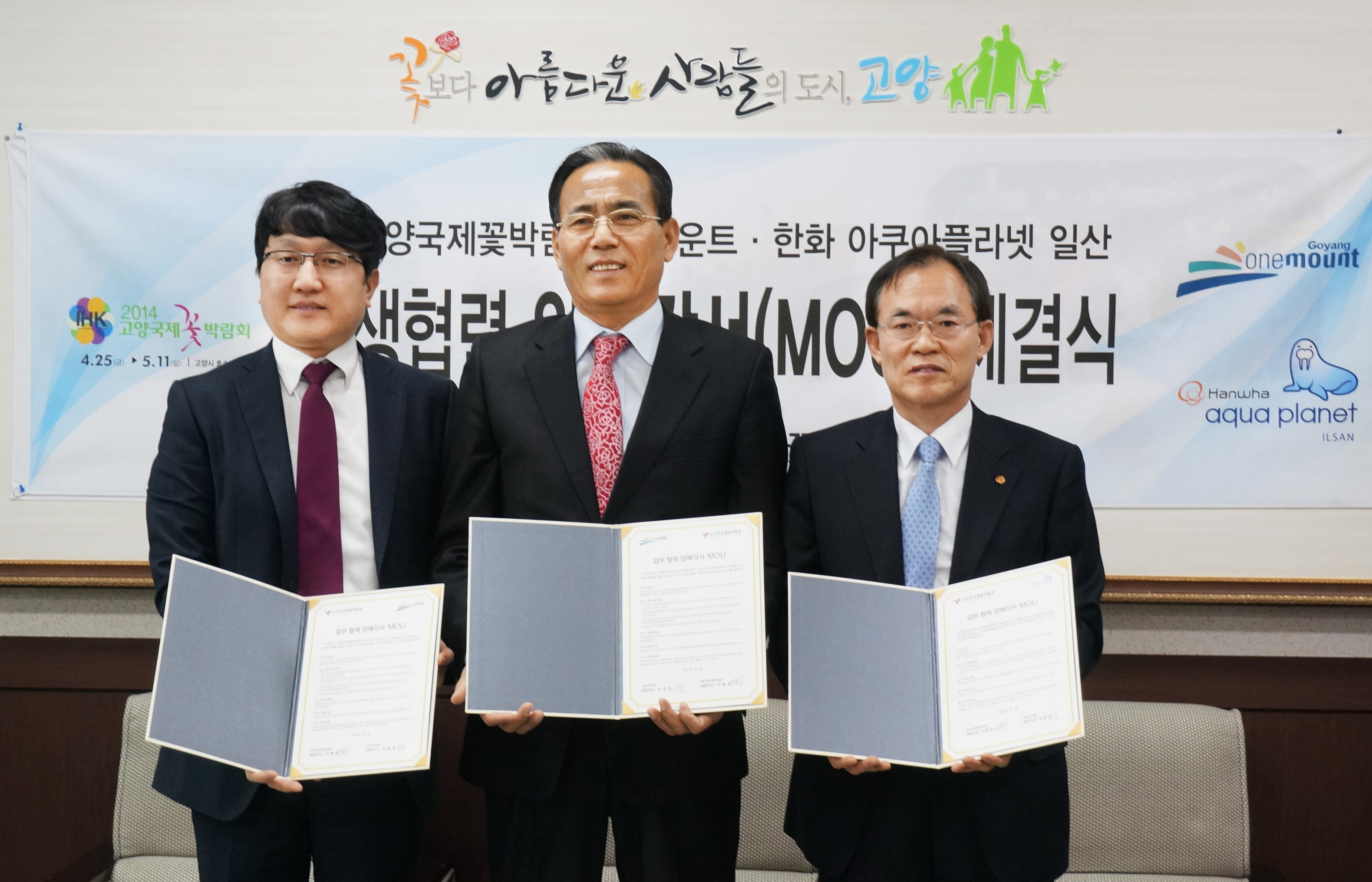 (재)고양국제꽃박람회는 2014고양국제꽃박람회의 성공적 개최와 고양시 MICE 관광산업 활성화를 위해 한화아쿠아플라넷 일산, (주)원마운트와 지난 6일 고양꽃전시관에서 상생협력 MOU를 체결하였다.
