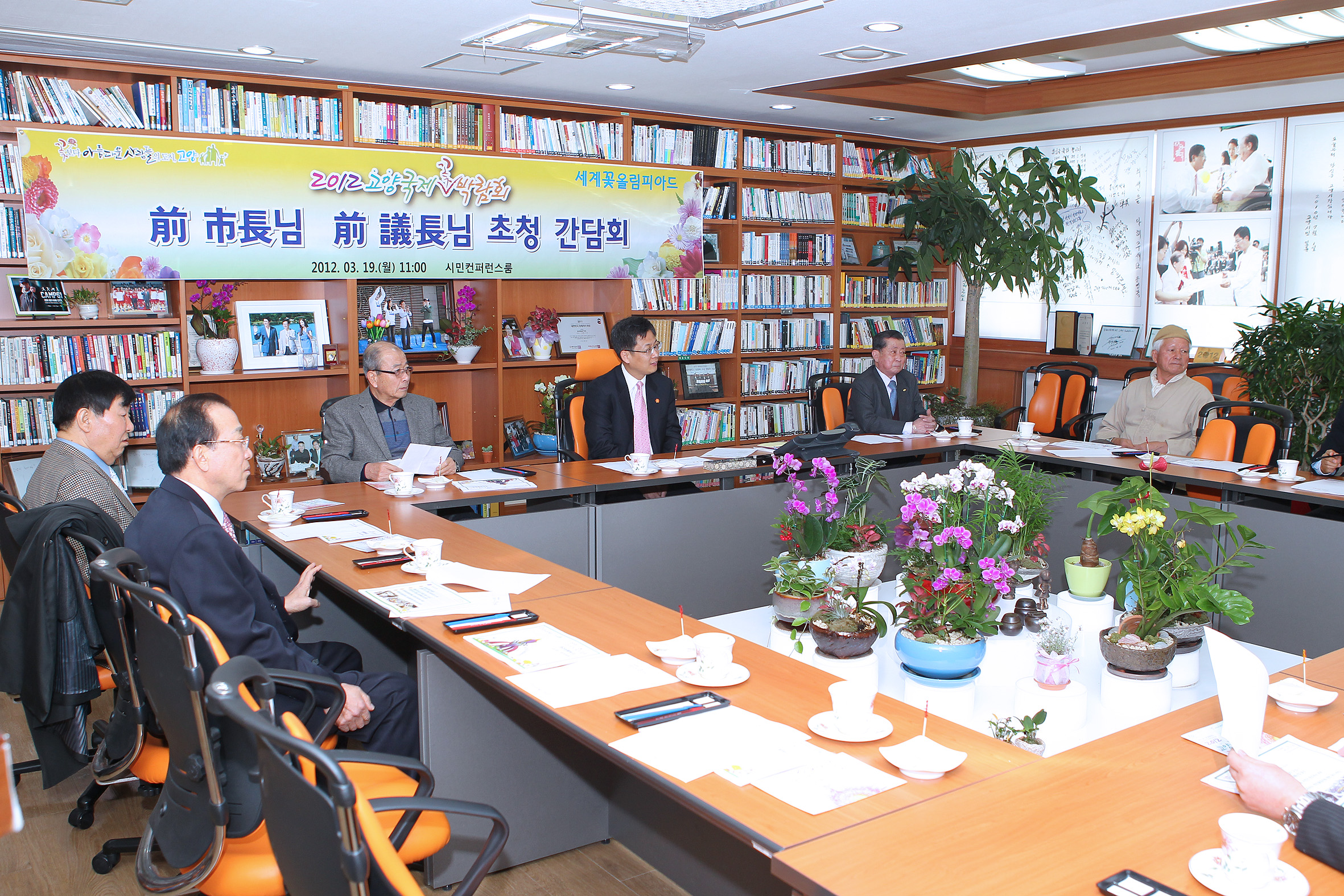 글로벌 꽃문화 축제 「2012고양국제꽃박람회」의 개선의견 청취를 위해 19일 前 시의회 의장 초청 간담회를 개최했다. 이철의 초대의장, 허준, 정광연 前 의장 등이 참석한 가운데, 고양시 발전을 함께한 역대의장들의 고견을 듣는 뜻 깊은 자리였다.