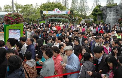 고양국제꽃박람회를 찾은 관람객들로 인해 호수공원이 인산인해를 이루고 있다. 궂은 날씨에도 불구하고 첫 주말인 26일 하루 방문객 수가 7만 명에 달한다. 세계 25개국 264개 업체가 참여하는 이번 박람회는 「온누리 꽃누리」를 주제로 꽃을 통해 느낄 수 있는 최고의 감동과 아름다움을 선사하고 있다.
