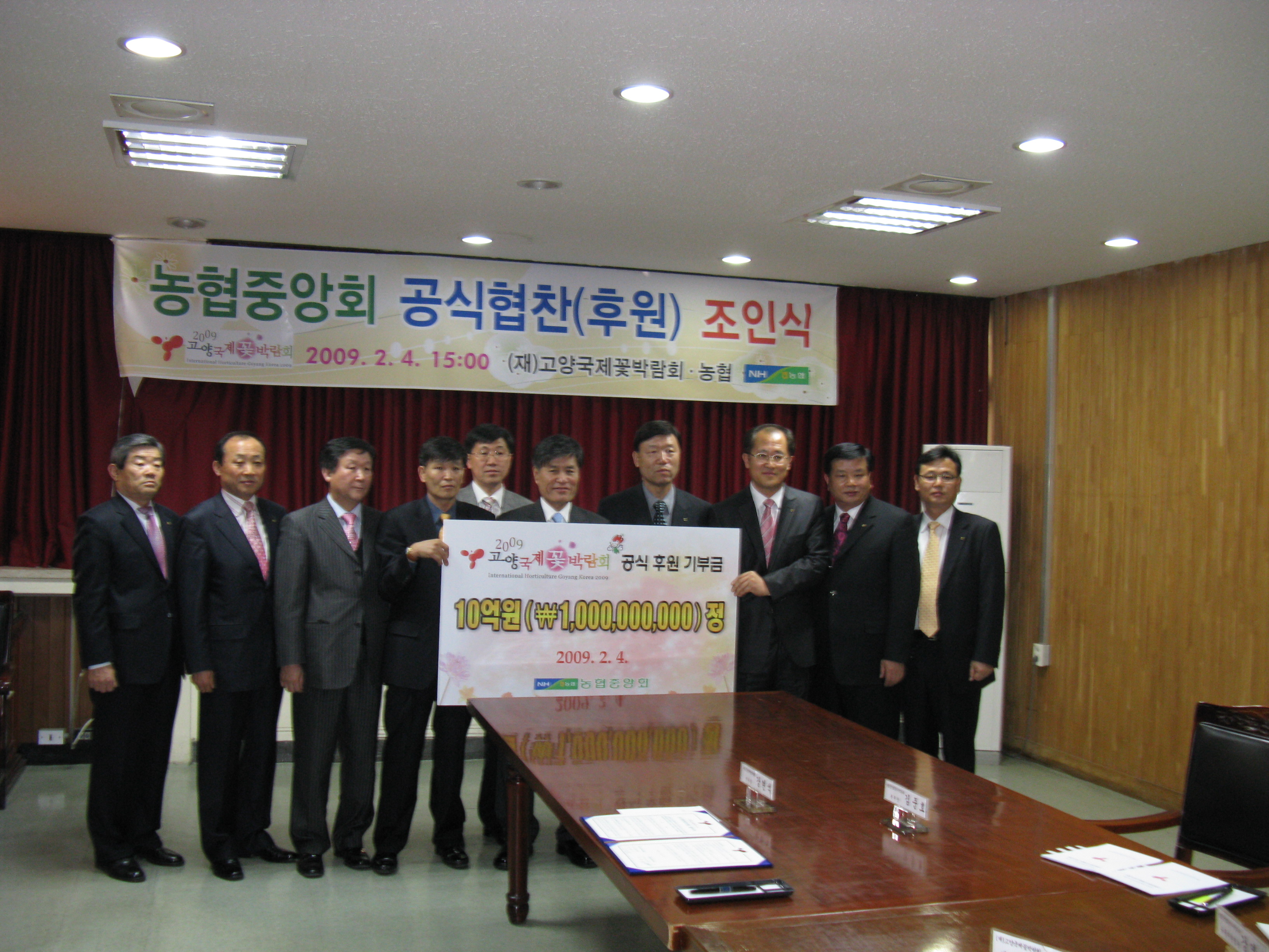 금년도 4월 23일부터 5월 10일까지 고양시 일산호수공원에서 개최되는 “2009고양국제꽃박람회”에 농협이 공식후원은행 협찬사로 선정되어 2월4일 고양시청에서 강현석 (재)고양국제꽃박람회 이사장(고양시장)과 이영호 농협중앙회 고양시지부장이 만나 조인식을 가졌다.