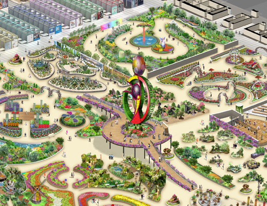 그 밖에 전시연출에서는 꽃의 아름다움을 통해 생활의 여유를 느낄 수 있는 대륙별꽃정원을 비롯하여 토피어리로 만화 캐릭터를 연출하는 어린이정원, 파노라마 형태의 파도정원 등 6개의 테마로 꾸며진 대규모 실내정원이 그 화려한 자태를 뽐낼 예정이다. 이번 행사의 테마인 ‘꽃과 하나되는 세상’을 표현한 주제관과 곤충 및 표본을 선보일 자연생태관 그리고 세계화훼디자인의 흐름을 한눈에 볼 수 있는 화훼장식관을 비롯한 세계관, 한국관, 분재관, 선인장관, 자생화관, 체험관, 농협관, 오감체험관, 모자이크정원 등이 웅장한 자태를 뽑낼 예정이다.