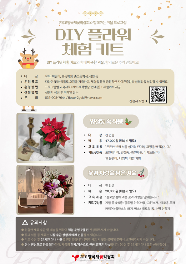 (재)고양국제꽃박람회(이사장 이동환)는 지난 4월부터 운영되어 전국의 교육기관으로부터 호평받고 있는 「DIY 플라워 체험 키트」 ‘겨울 프로그램’을 12월까지 운영한다고 밝혔다.