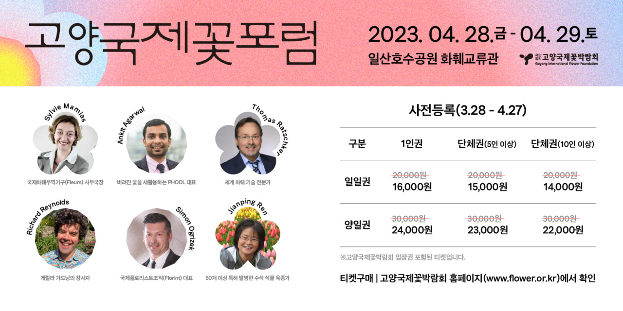 2023고양국제꽃포럼은 2023년 4월 28일(금), 29일(토) 양일간 일산호수공원 화훼교류관에서 진행되며, 사전에 연사들의 발표 내용을 적은 사전자료집이 E-BOOK으로 출간될 예정이다.
