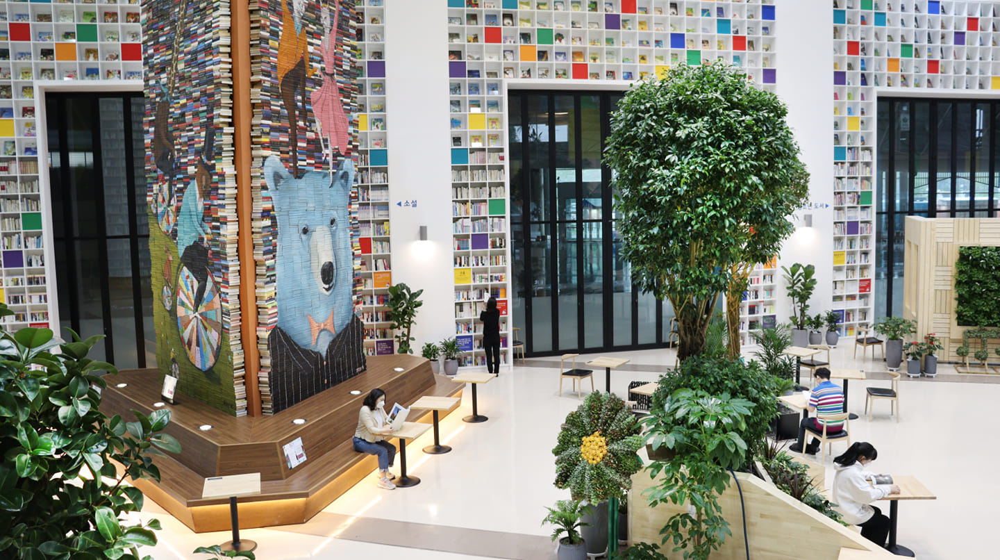 ‘플라워 북카페’ 1층에는 도서 열람 및 휴식 장소와 함께 다양한 볼거리가 자리잡고 있다. 9m 높이의 초대형 북트리 ‘원더랜드’ 작품이 내부에 자리잡고 있으며, 꽃과 거북, 동굴 등을 연상시키는 엄선된 수석작품 72점도 별도 코너에 전시된다.