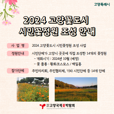 「2024 고양꽃도시 시민꽃정원 조성사업」은 꽃의 도시 고양시의 화훼 브랜드 가치를 높이고 시민에게 친숙한 꽃문화를 키워나가는 것을 목표로 하여 시민단체에 꽃씨를 제공하여 각 단체가 직접 꽃밭을 가꿀 수 있도록 지원하는 사업이다.