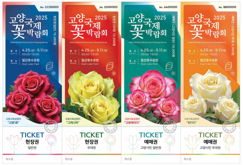 특히, 올해의 2025고양국제꽃박람회 입장권은 고양시에서 육성하여 품종 등록한 장미 중 우수 8품종의 이미지를 활용하여, 고양시 화훼 품종의 우수성을 홍보하고 도시 브랜드 이미지를 제고하기 위하여 디자인하였다.
